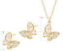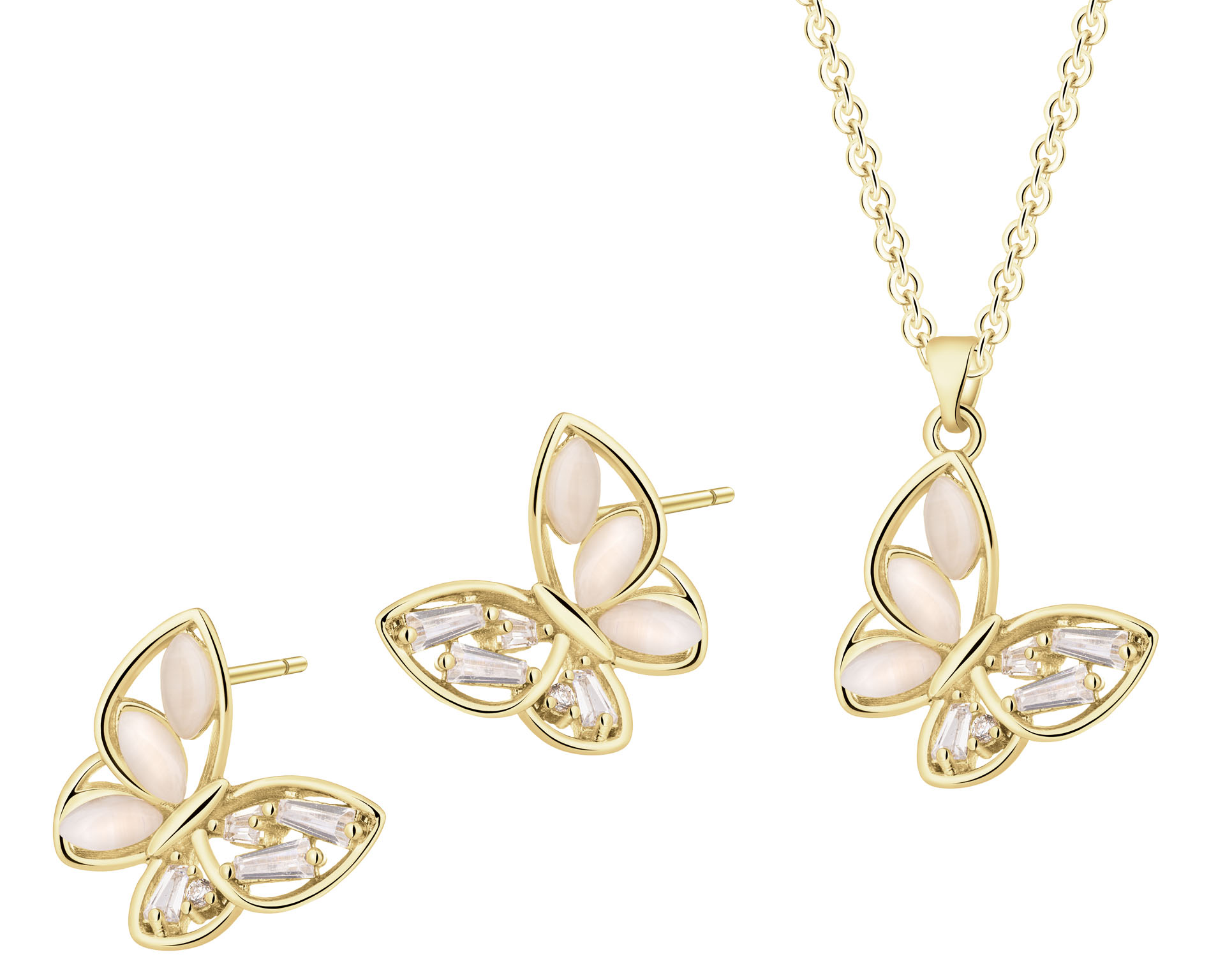 Pozlacené náušnice a náhrdelník z mosazi se zirkony a kočičím okem - motýli