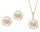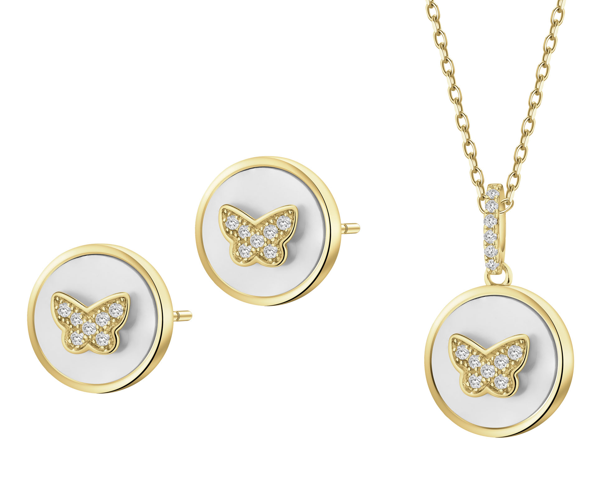 Pozlacené náušnice a náhrdelník z mosazi se zirkony a perletí - souprava - motýli